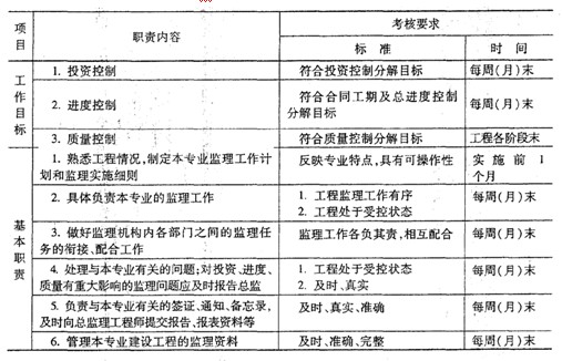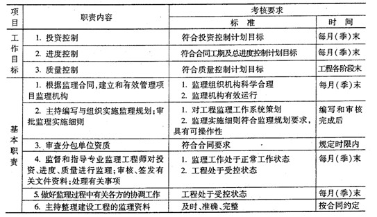 崗位職務(wù)及職責(zé)的確定,要有明確的目的性,不可因人設(shè)事。根據(jù)責(zé)權(quán)一致的原則,應(yīng)進行適當(dāng)?shù)氖跈?quán),以承擔(dān)相應(yīng)的職責(zé);并應(yīng)確定考核標(biāo)準(zhǔn),對監(jiān)理人員的工作進行定期考核,包括考核內(nèi)容、考核標(biāo)準(zhǔn)及考核時間。表5-1和表5-2分別為項目總監(jiān)理工程師和專業(yè)監(jiān)理工程師崗位職責(zé)考核標(biāo)準(zhǔn)。