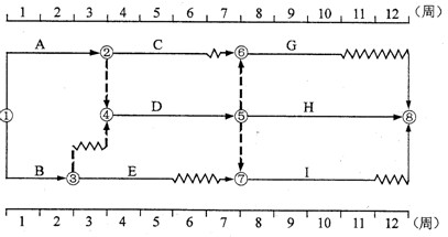 2.在上題所示的雙代號時標(biāo)網(wǎng)絡(luò)計劃中,如果A.E.G三項工作共用一臺施工機(jī)械而必須順序施工,則該施工機(jī)械在現(xiàn)場的最小閑置時間為( A )周。