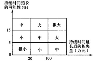 某工程,施工單位向項(xiàng)目監(jiān)理機(jī)構(gòu)提交了項(xiàng)目施工總進(jìn)度計(jì)劃(圖1)和各分部工程的施工進(jìn)度計(jì)劃。項(xiàng)目監(jiān)理機(jī)構(gòu)建立了各分部工程的持續(xù)時(shí)間延長(zhǎng)的風(fēng)險(xiǎn)等級(jí)劃分圖(圖2)和風(fēng)險(xiǎn)分析表(表1),要求施工單位對(duì)風(fēng)險(xiǎn)等級(jí)在“大”和“很大”范圍內(nèi)的分部工程均要制定相應(yīng)的風(fēng)險(xiǎn)預(yù)防措施。