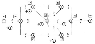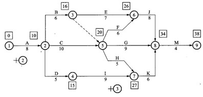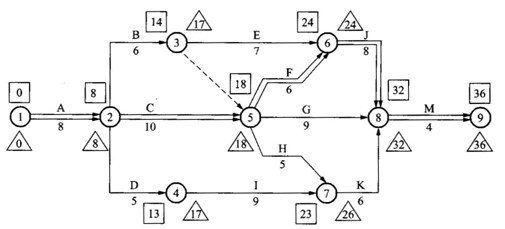 “口”中數(shù)據(jù)為節(jié)點(diǎn)最早時(shí)間或ES:“△”中數(shù)據(jù)為節(jié)點(diǎn)最遲時(shí)間或LF(圖2)(1分)。
