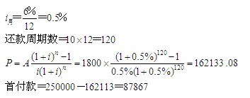 某家庭欲購買總價為25萬元的一套住宅。該家庭月收入為6000元,準(zhǔn)備用月收入地30%來支付抵押貸款月還款額。已知貸款期限為10年,按月等額償還,年貸款利率為6%.則該家庭的首付款額是( )元