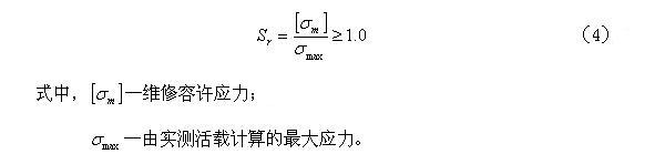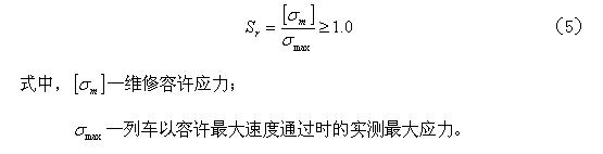 、鄹鶕(jù)實(shí)測(cè)的列車(chē)活載(軸重和軸距),計(jì)算最大應(yīng)力(用實(shí)測(cè)斷面計(jì)算),進(jìn)而用下式評(píng)定現(xiàn)有的應(yīng)力比: