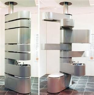這個廁所并不僅僅只包括一個馬桶,而是一個完整的盥洗室。各功能部位靠中心一個垂直的椎骨相連,頂部包括一個成人淋浴噴頭和一個兒童淋浴噴頭,中部則是儲物空間和控制臺,底部則是一個馬桶和水池。這就意味著,你可以同時洗頭、刷牙。