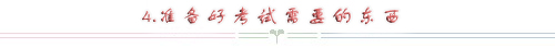 首先是準考證、身份證這樣重要的證件,另外是考試需要的文具了。多準備幾只黑色中性筆,不要討論什么圓珠筆能不能用之類的,現(xiàn)在辦公都是使用中性筆了,而且顏色純正比較正式,考試的時候還是給閱卷老師一個清爽規(guī)范的感覺。2B鉛筆、橡皮擦、小刀、計算器(科學計算器足矣);當然更重要的是要帶上一塊表,時刻提醒和控制自己的答題時間,不要因為一兩個難題浪費了時間、影響了大局。