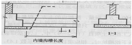 內(nèi)墻溝槽,按圖示基礎(chǔ)(含墊層)底面之間凈長度計算;