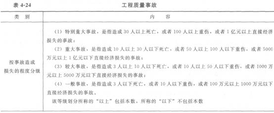質(zhì)量不合格和質(zhì)量缺陷;質(zhì)量問題和質(zhì)量事故;特別重大事故;重大事故;較大事故;一般事故;指導(dǎo)責(zé)任事故;操作責(zé)任事故;自然災(zāi)害事故。