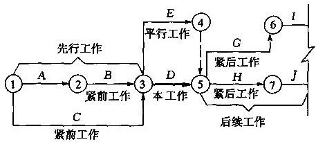 由上述邏輯關(guān)系術(shù)語的概念可看出,它們是有針對性的。一項(xiàng)工作的稱謂與所要考查的對象有關(guān),因此具有相對性,如當(dāng)考查工作H時(shí),H則為本工作,這時(shí),工作D、E為緊前工作,工作J為緊后工作。工作間的邏輯關(guān)系是正確繪制網(wǎng)絡(luò)圖的基礎(chǔ)。