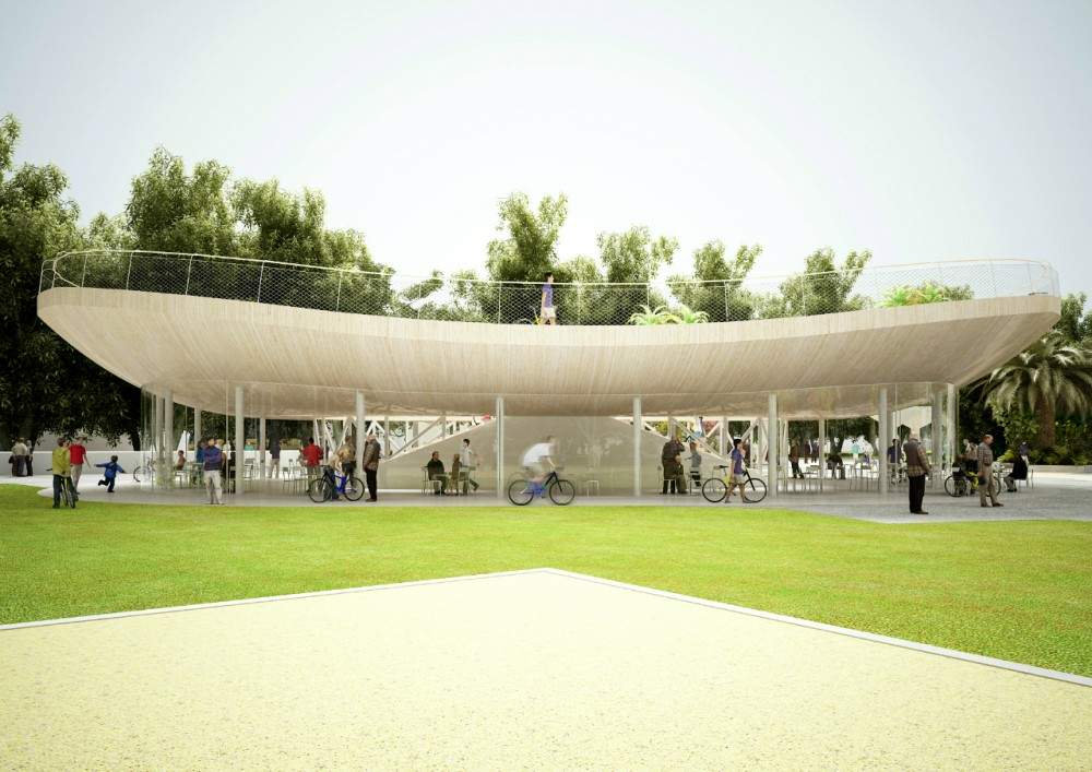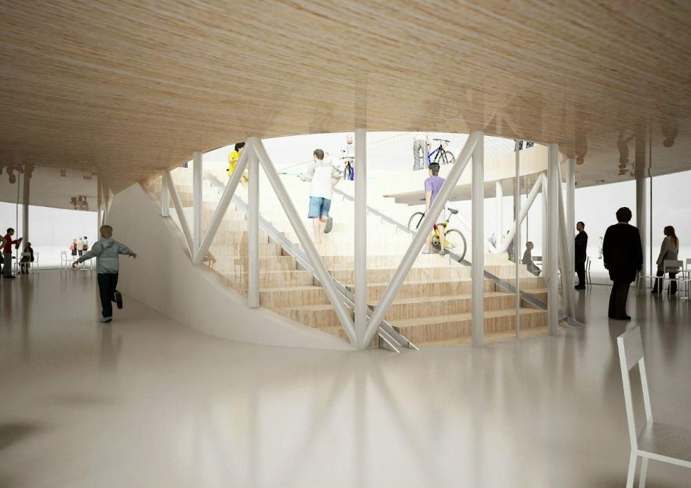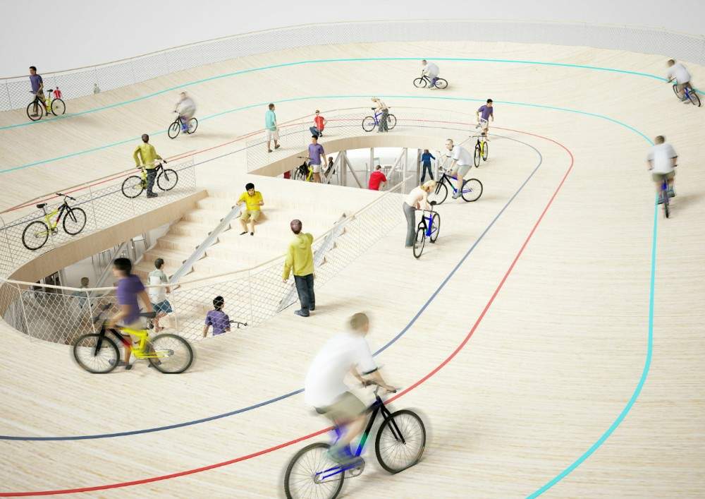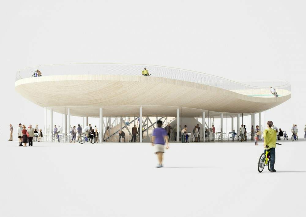 該項(xiàng)目是由阿姆斯特丹建筑事務(wù)所NL architects設(shè)計(jì)的“自行車俱樂部”,位于中國海南。一個(gè)屋頂自行車跑道由底層的玻璃幕墻咖啡館支撐。建筑師根據(jù)當(dāng)?shù)氐臒釒夂颍跈E圓形的建筑物上設(shè)計(jì)了一個(gè)突出的大屋頂,為周邊的看臺座位遮陰避雨。優(yōu)雅上揚(yáng)的曲線屋頂讓人聯(lián)想到傳統(tǒng)且具有功能性的東方寺院寶塔。參觀者可以通過一個(gè)凹槽,步行去到兩個(gè)樓梯,將自行車移動到露天單車賽道上。隱藏在樓梯下方的區(qū)域包含了公共休息室等空間。