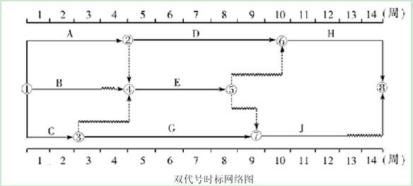 雙代號時(shí)標(biāo)網(wǎng)絡(luò)計(jì)劃是以時(shí)間坐標(biāo)為尺度編制的網(wǎng)絡(luò)計(jì)劃,以實(shí)箭線表示工作,以虛箭線表示虛工作,以波形線表示工作的自由時(shí)差。