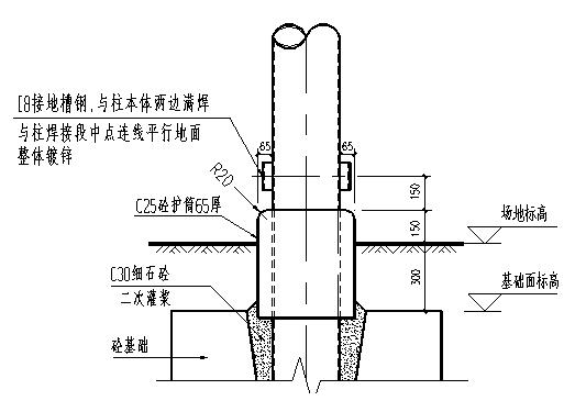 。3)基礎(chǔ)可采用現(xiàn)澆或預(yù)制后埋設(shè)的方式,圍欄內(nèi)設(shè)置150mm厚C20素混凝土地面,標高平場地,按0.3%坡度坡向圍欄外;為防止積水腐蝕立柱柱腳,立柱基礎(chǔ)高出素混凝土地面100mm.