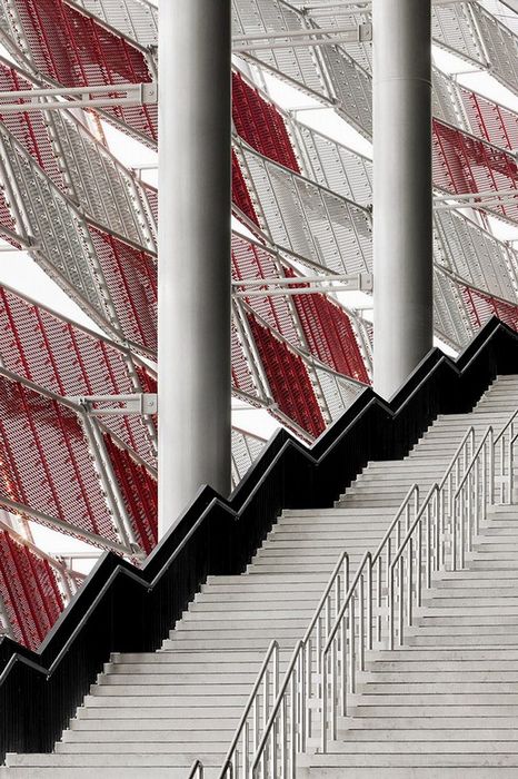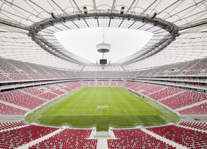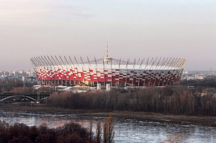 波蘭的國家體育館是基源于Dziesie Ciolecia體育場的基礎(chǔ)上進行改建的,其地理位置位于華沙城市中心區(qū)域的東部,比鄰維斯瓦河河畔城市體育區(qū)的核心位置。這個體育館被等分為對稱的兩個區(qū)域,由預(yù)制混凝土構(gòu)成的建筑主體看臺部分,以及構(gòu)建在斜拉桿獨立式鋼鐵支架上的帶有紡織層面的鋼絲網(wǎng)屋頂部分組成。內(nèi)部的屋頂是由折疊在一起的移動膜組成的。體育館擁有一個立方體四屏幕顯示屏,可以為坐在任何一個角度的觀眾提供最佳的視線。 另外,人們可以通過體育館四周的12個拱形的單行梯階達到建筑主體的頂部夾層。建筑外立面使用的金屬材料可以提供一個保暖而透明的外殼。場館的主體顏色選用為紅白色主調(diào)以表現(xiàn)其國家的地標性。