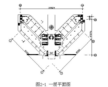 工程的建筑方案由美國××公司設(shè)計,××設(shè)計研究院負責施工圖設(shè)計,大廈主體建筑平面呈“V”型,南北長約102.7m,東西寬62.5m,建筑造型錯落有致,簡潔明快,壯觀豪華,功能齊全。建筑物檐口高度為49.7m,外墻裝飾為花崗巖、玻璃幕墻、鋁板以及石材格柵相結(jié)合組成,輔以遮陽板結(jié)構(gòu)體系,加上上部結(jié)構(gòu)逐層收縮的建筑處理手法,使整個建筑物既有中國傳統(tǒng)的雄偉堅實的建筑格調(diào),又具有簡潔明快的現(xiàn)代化建筑風格。其平面圖、剖面圖見附圖2-1、附圖2-2。工程具有先進的通訊系統(tǒng)、安全可靠的供電系統(tǒng)、火災(zāi)自動報警系統(tǒng)、綜合布線系統(tǒng)、變頻中央空調(diào)系統(tǒng)、高低壓給水系統(tǒng)、排水系統(tǒng)以及辦公自動化系統(tǒng)等,設(shè)八部自動電梯,其中兩部為消防電梯。鍋爐共6臺,為0.6MPa全自動熱水鍋爐。通過先進的智能化樓宇集成、樓宇自控,使大廈建成為一流的現(xiàn)代化寫字樓。