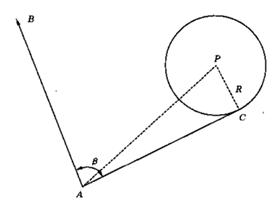 圓柱偏心測(cè)量是單距離偏心測(cè)量的一個(gè)特殊情況,待測(cè)點(diǎn)P為某一圓柱形物體的圓心,如圖3所示。觀測(cè)時(shí),全站儀安置在已知點(diǎn)A,并照準(zhǔn)另一已知點(diǎn)B進(jìn)行定向;然后,將反射棱鏡設(shè)置在圓柱體的一側(cè)C點(diǎn),且使AC與圓柱體相切;輸入圓柱體的半徑R,并對(duì)偏心點(diǎn)C進(jìn)行觀測(cè),儀器就會(huì)自動(dòng)計(jì)算并顯示待測(cè)點(diǎn)的坐標(biāo)(xP,yP)或測(cè)站點(diǎn)至待測(cè)點(diǎn)的距離D和方位角αAB.其計(jì)算公式與單距離偏心測(cè)量相同,只不過用R和90°代替d和θ。
