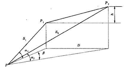 在與P1、P2通視的任一點(diǎn)P上安置全站儀,首先觀測(cè)P至P1、P2的斜距S1、S2,豎直角α1、α2,以及PP1至PP2間的水平夾角β,然后可由余弦公式計(jì)算P1P2的平距D和高差h: