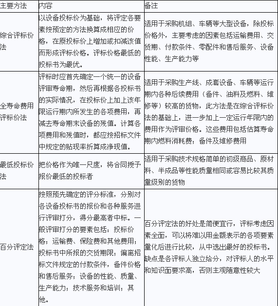 表  設(shè)備、材料采購(gòu)的評(píng)標(biāo)方法