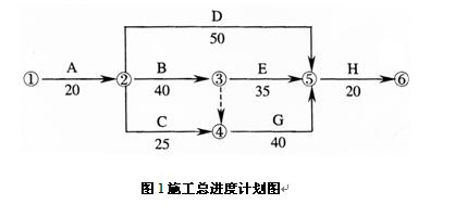 [例1]某建設(shè)單位和施工單位按照《建設(shè)工程施工合同(示范文本)》簽訂了施工合同,合同中約定建筑材料由建設(shè)單位提供,由于非施工單位原因造成的停工,機械補償費為200元/臺班,人工補償費為50元/日工;總工期為120天;竣工時間提前獎勵為3000元/天,誤期損失賠償費為5000元/天。經(jīng)項目監(jiān)理機構(gòu)批準(zhǔn)的施工進度計劃如圖1所示(單位:天)。