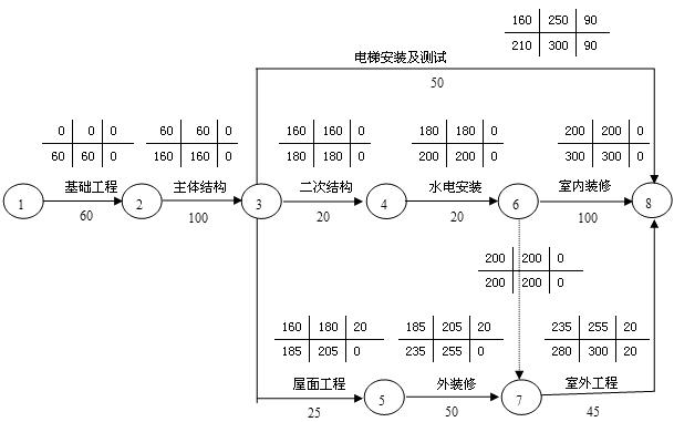 第4小題:上述施工網(wǎng)絡(luò)計(jì)劃中,電梯安裝及調(diào)試工作的總時(shí)差為(?。┨?。
