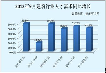 據(jù)建筑英才網(wǎng)最新數(shù)據(jù)顯示,截至2012年9月初,建筑人才總體需求較去年同期增長(zhǎng)14.8%,增長(zhǎng)勢(shì)頭穩(wěn)中有升。其中,漲幅最為顯著的,為室內(nèi)設(shè)計(jì)師和精裝設(shè)計(jì)師,其需求較去年同期增長(zhǎng)分別為59.5%和59.1%,系熱門職位之首;而幕墻設(shè)計(jì)師和軟裝設(shè)計(jì)師需求較去年同期增長(zhǎng)分別為53.7%和50%,增幅達(dá)五成以上,其炙手可熱程度不可小覷。同時(shí),配飾設(shè)計(jì)師也備受追捧,其需求較去年同期增長(zhǎng)達(dá)48.5%.另外,裝飾設(shè)計(jì)師需求較去年同期增長(zhǎng)18.6%,依然如故成為眾家名企獵聘的對(duì)象。金九銀十期間裝飾裝修人才供需如火如荼,人才需求將持續(xù)高漲。