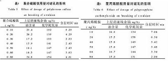 實(shí)驗(yàn)過(guò)程中條件控制為:pH始=1.5,pH終=7.0,聚丙烯胺為80mgL,對(duì)不同用量聚合硫酸鐵時(shí)破乳的情況進(jìn)行了研究,試驗(yàn)結(jié)果如表5。