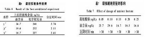 從表7可知,腐植酸鈉對(duì)脫除廢水中油有明顯效果,隨著腐植酸鈉用量增加,當(dāng)腐植酸鈉用量大于0.15mgL時(shí),可將油脫到20.0mgL以下,但是單獨(dú)使用腐植酸鈉帶來(lái)明顯的缺點(diǎn),主要是渣松散,分層速度慢,同時(shí),出水pH值不易控制。綜上所述,根據(jù)條件實(shí)驗(yàn)得出的結(jié)果進(jìn)行綜