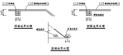 在梅江水流和雨季匯水沖刷下,護(hù)坡側(cè)面邊界、底部邊界形成掏空,會影響模袋護(hù)坡整體穩(wěn)定性,直接影響護(hù)坡安全,因此,模袋頂部、側(cè)邊采取順坡挖溝、模袋折角及回填砼處理,底部邊界作大塊石壓腳處理,邊界處理見圖4。