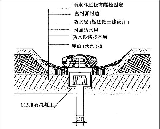 (4)根據(jù)建筑物的使用功能及建筑設(shè)計(jì)圖、屋頂建筑平面圖、屋面建筑物構(gòu)造圖和室外雨水管設(shè)計(jì)圖,確定雨水斗和水平懸吊管的設(shè)計(jì)位置和標(biāo)高。