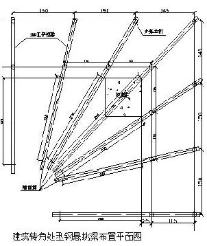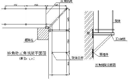施工現(xiàn)場的型鋼懸挑外架在立面的轉(zhuǎn)角處的處理方法一般采用輻射式布置型鋼梁,這在小截面的角柱情況尚可行,但通常高層建筑的框架柱截面較大,采用輻射式布置型鋼梁,一般會遇到1-3根的型鋼懸挑梁布置在框架柱內(nèi),這使行柱筋偏位,柱內(nèi)的型鋼梁處的砼不密實,影響框架柱的質(zhì)量,有可能造成重大安全隱患。且采用輻射方式布置型鋼梁的方法,使得外架轉(zhuǎn)角處的立桿間距布置不一,個別內(nèi)立桿未能落在型鋼梁上,成為虛腳現(xiàn)象。因在轉(zhuǎn)角處采用輻射梁布置,使得懸挑梁的長度較長,在無塔吊配合情況下,拆除型鋼梁相當不便,或只能將型鋼梁割短后再拆除。因此建議在外架的轉(zhuǎn)角處的型鋼挑梁改用型鋼三角挑架。