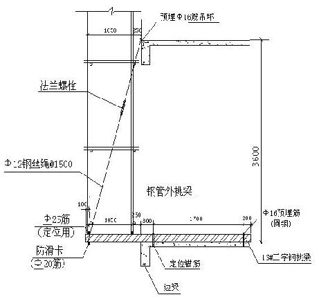 因此在一般情況下在陽臺處不允許型鋼懸挑梁直接傳力給陽臺等懸挑板,若考慮懸挑梁傳力至陽臺處的框架邊梁,則型鋼懸挑梁的布置長度則需要較長,這給搭設、拆除的操作帶來較大的不便。在該處的處理方法可采用筒支梁布置方式,即型鋼梁一端擱置在邊框梁上,另一端采用鋼絲繩上拉至再上一層的陽臺處的邊框梁,如下圖布置。
