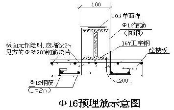 對預埋筋的受力驗算一般都能滿足要求,但對于樓板厚度較小的應驗算預埋筋與結(jié)構(gòu)樓板之間的承載力驗算。在預埋筋外的樓板應加強梏配筋措施,宜增配2Φ12筋,長度2m。當預埋錨筋處的樓板面無負筋時,應增設Φ6@200×200鋼筋網(wǎng)片2m見方,且應與周邊的樓板負筋連接在一起。如下圖所示。