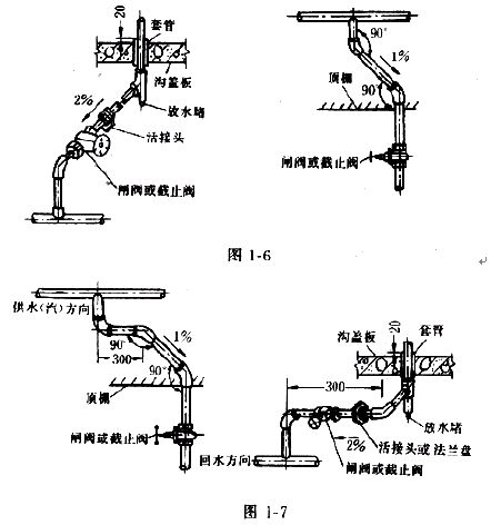 3.5.3熱水立管:按設計要求加好套管。立管與導管連接要采用2個彎頭(圖1-6)。立管直線長度大于15m時,要采用3個彎頭(圖1-7)。立管如有伸縮器安裝同干管。