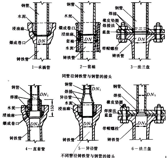 3.4.1.4給水鑄鐵管與鍍鋅鋼管連接時應按圖1-5的幾種方式安裝。