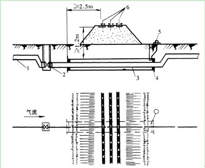 圖5-5 燃?xì)夤艿来┰借F路1-燃?xì)夤艿溃?-閥門(mén);3-套管;4-密封層;5-檢漏管;6-鐵道二、穿越公路