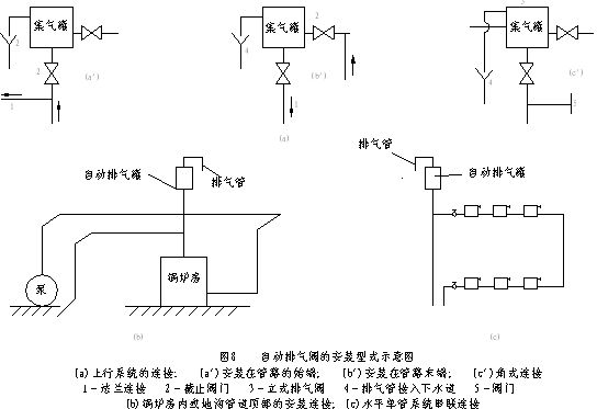 (3)自動(dòng)排氣閥的安裝方法及技術(shù)要求:應(yīng)根據(jù)下列要求安裝(見圖8)。
