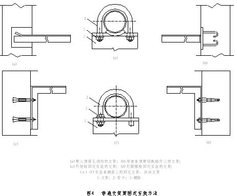 (3)支架安裝方法:管道支架安裝的時(shí)間應(yīng)在工程主體完工后裝修工程施工前進(jìn)行;常用的安裝方法,有預(yù)留孔洞埋入、預(yù)埋鋼板的焊接、射釘及膨脹螺栓和型鋼包柱等安裝方法(見圖4及圖5所示)。