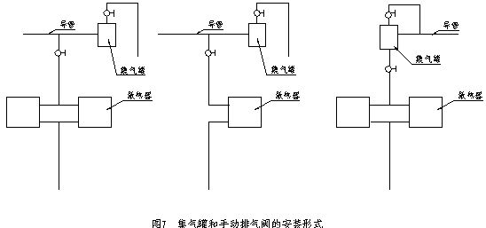 (1)手動(dòng)排氣閥:安裝在低中層住宅采暖系統(tǒng)中。一般情況下,集氣罐后部應(yīng)安裝主管裝置,導(dǎo)管末端與集氣罐焊接時(shí),其管底與罐底應(yīng)取平連接,實(shí)際安裝方法見7所示。