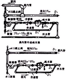 3.3.1水平安裝的管道要有適當(dāng)?shù)钠露龋?dāng)坡向與蒸汽流動(dòng)方向一致時(shí),應(yīng)采用i=0.003的坡度,當(dāng)坡向與蒸汽流動(dòng)方向相反時(shí),坡度應(yīng)加大到i=0.005~0.01。干管的翻身處及末端應(yīng)設(shè)置疏水器(圖1-35)。