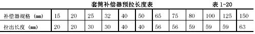 3.6.2套筒補(bǔ)償器的預(yù)拉伸長(zhǎng)度應(yīng)根據(jù)設(shè)計(jì)要求,設(shè)計(jì)無(wú)要求時(shí)按表l-20要求預(yù)拉伸。預(yù)拉伸時(shí),先將補(bǔ)償器的填料壓蓋松開(kāi),將內(nèi)套管拉出預(yù)拉伸的長(zhǎng)度,然后再將填料壓蓋緊住。