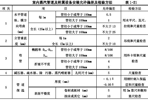 室內(nèi)蒸汽管道及附屬裝置安裝允許偏差及檢驗(yàn)方法見(jiàn)表1-21。