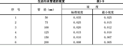 6.6排水管道坡度過小或倒坡,均影響使用效果,各種管道坡度必須按設(shè)計要求找準(zhǔn),如設(shè)計無要求時,可參照表1-9的要求進(jìn)行安裝。