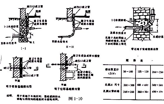6.7排水管道穿墻、穿基礎(chǔ)時應(yīng)按圖1-10安裝。排出管與立管的連接宜采用兩個45°彎頭或彎曲半徑不小于4倍管徑的90°彎頭,否則管道容易堵塞。