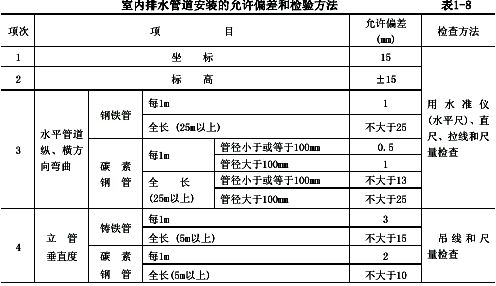 室內(nèi)排水管道安裝的允許偏差和檢驗方法表1-8