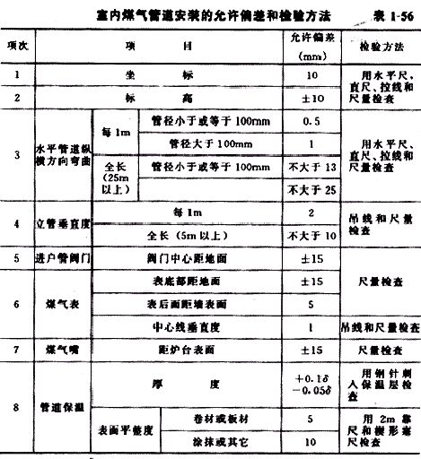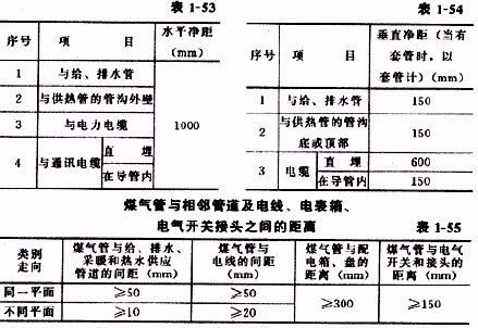 4.1.4煤氣引入管和室內(nèi)煤氣管道與其它各類管線、電力電纜、電線和電氣開關(guān)的最小水平、垂直和交叉凈距,必須符合設(shè)計要求或表l-53~表1-55的規(guī)定。