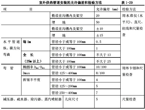 室外供熱管道安裝的允許偏差和檢驗方法見表1-29.