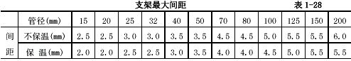 3.3.4通行地溝的管道應安裝在地溝的一側或兩側,支架應采用型鋼,支架的間距要求見表1-28.管道的坡度應按設計規(guī)定確定。