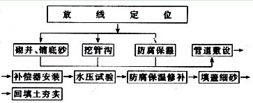放線定位→挖土方→砌管溝→卡架制安裝→管道安裝→補償器安裝→水壓試驗→防腐保溫→蓋溝蓋板→回填土
