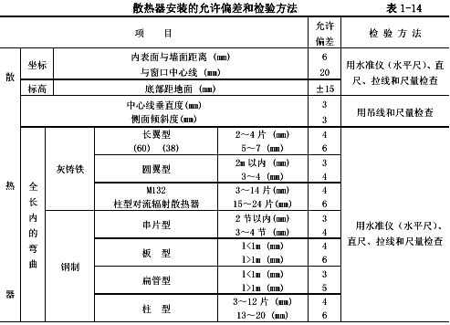 散熱器安裝位置按設(shè)計(jì)要求確定,設(shè)計(jì)無(wú)要求時(shí)自定安裝位置應(yīng)一致;掛裝散熱器距地高度按設(shè)計(jì)確定,設(shè)計(jì)無(wú)要求時(shí),一般不低于150mm,但明裝散熱器上表面不得高于窗臺(tái)標(biāo)高。散熱器安裝坐標(biāo)、標(biāo)高等允許偏差和檢驗(yàn)方法見(jiàn)表l-14。
