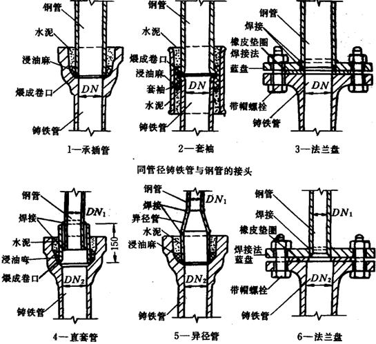 3.4.1.4給水鑄鐵管與鍍鋅鋼管連接時應(yīng)按圖3.4.1.4的幾種方式安裝。