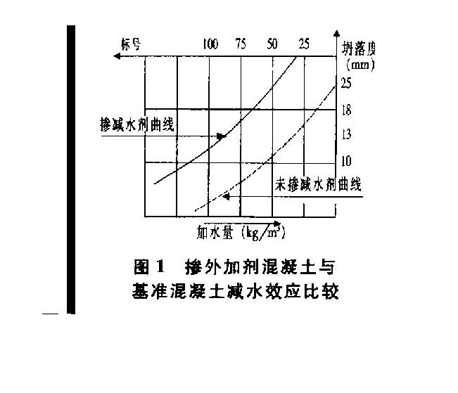在本工程施工中,地下室底板使用KFDN-SP8外加劑,看臺樓層等混凝土結(jié)構(gòu)根據(jù)具體情況,選用HPM一2高效緩凝減水劑、FE-C2外加劑等,這些高效外加劑具有高減水率和良好的保塑性能。摻外加劑混凝土與基準混凝土的減水效應(yīng)比較如圖1所示。