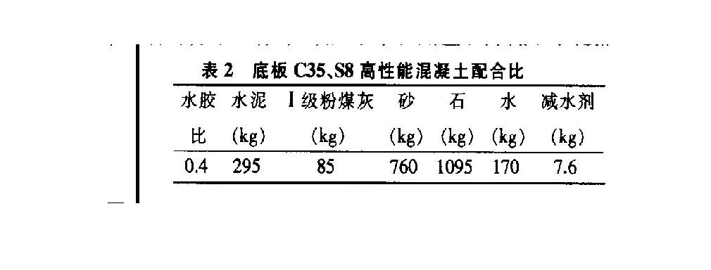 、芡ㄟ^試驗選定收縮率較小的配合比。為了確;炷辆哂懈咝阅,我們提前對混凝土配合比進行了大量反復(fù)多次的試驗,取得十幾組試配數(shù)據(jù),測試了不同配合比混凝土的收縮率及收縮與齡期的關(guān)系,并采用鋼環(huán)試驗方法測試混凝土的長期收縮情況。測定混凝土收縮率后,有意識地模擬澆筑一塊混凝土試件進行試驗,測試其溫度變化和收縮率,確定了表2的配合比,其收縮率為0.12%,且在14d后基本上不再收縮。實踐證明,本配合比是成功的,用I級粉煤灰代替部分水泥,大大減少了水泥用量和降低了水化熱,在確定了收縮率較小的配比后,據(jù)此收縮率確定底板分塊的最大長度為45m,相鄰塊之間混凝土澆筑的時間間隔為14d。