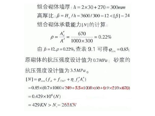 以上計(jì)算中略去了原墻體的承載能力,可見(jiàn)組合砌體的加固效果是十分安全的,按計(jì)算兩邊的混凝土可以更薄,但小于60mm將引起施工的困難,故仍按原來(lái)的構(gòu)造要求定的方案進(jìn)行加固。